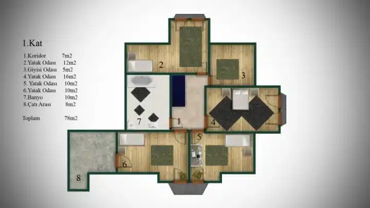 7 oda + geniş salon: Büyük aileler için geniş ve konforlu yaşam alanı.